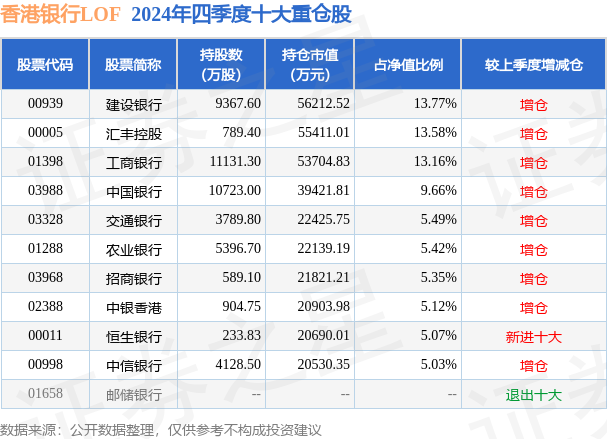 香港银行LOF为指数型-股票基金,根据最新一期基金季报显示,该基金资产配置:股票占净值比92.18%,无债券类资产,现金占净值比30.87%。基金十大重仓股如下: