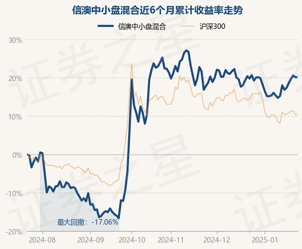 证券之星消息,1月23日,信澳中小盘混合最新单位净值为1.357元,累计净值为2.373元,较前一交易日上涨0.0%。历史数据显示该基金近1个月上涨0.15%,近3个月下跌2.16%,近6个月上涨19.98%,近1年上涨10.33%。该基金近6个月的累计收益率走势如下图: