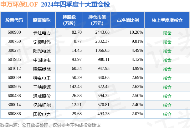 申万环保LOF为指数型-股票基金,根据最新一期基金季报显示,该基金资产配置:股票占净值比93.82%,无债券类资产,现金占净值比9.01%。基金十大重仓股如下: