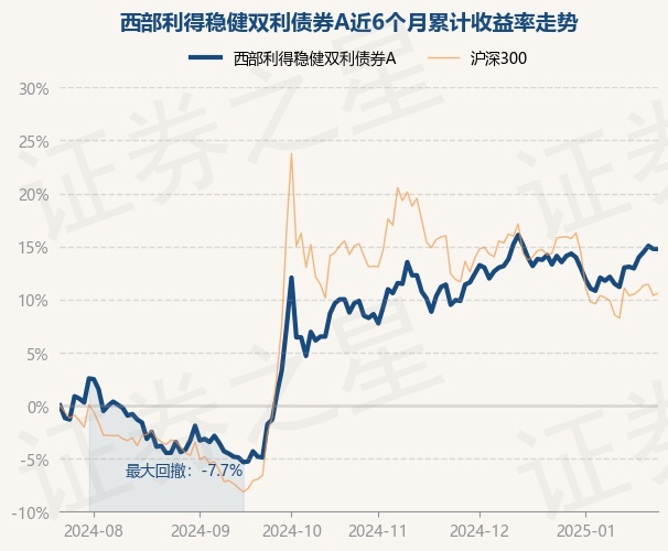 证券之星消息,1月23日,西部利得稳健双利债券A最新单位净值为1.565元,累计净值为1.72元,较前一交易日上涨0.0%。历史数据显示该基金近1个月上涨0.97%,近3个月上涨3.99%,近6个月上涨14.4%,近1年上涨13.49%。该基金近6个月的累计收益率走势如下图: