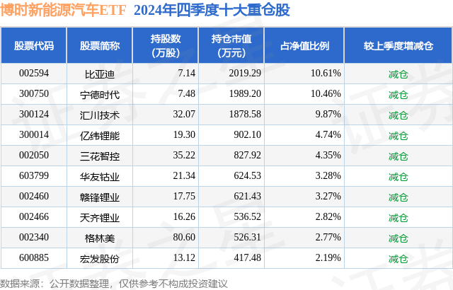 博时新能源汽车ETF为指数型-股票基金,根据最新一期基金季报显示,该基金资产配置:股票占净值比98.51%,无债券类资产,现金占净值比1.56%。基金十大重仓股如下: