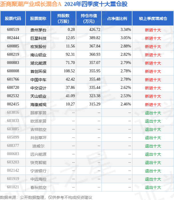 浙商聚潮产业成长混合A为混合型-偏股基金,根据最新一期基金季报显示,该基金资产配置:股票占净值比92.4%,债券占净值比3.17%,现金占净值比5.04%。基金十大重仓股如下: