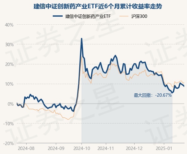 证券之星消息,1月23日,建信中证创新药产业ETF最新单位净值为0.5255元,累计净值为0.5255元,较前一交易日下跌0.53%。历史数据显示该基金近1个月下跌5.08%,近3个月下跌8.21%,近6个月上涨8.73%,近1年下跌6.41%。该基金近6个月的累计收益率走势如下图: