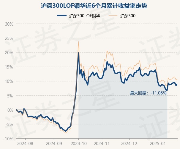 证券之星消息,1月23日,沪深300LOF银华最新单位净值为0.8448元,累计净值为0.8448元,较前一交易日上涨0.38%。历史数据显示该基金近1个月下跌2.89%,近3个月下跌3.73%,近6个月上涨8.87%,近1年上涨18.12%。该基金近6个月的累计收益率走势如下图: