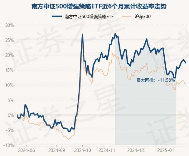 证券之星消息,1月23日,南方中证500增强策略ETF最新单位净值为0.9388元,累计净值为0.9388元,较前一交易日下跌0.42%。历史数据显示该基金近1个月下跌2.51%,近3个月下跌1.2%,近6个月上涨17.19%,近1年上涨19.09%。该基金近6个月的累计收益率走势如下图: