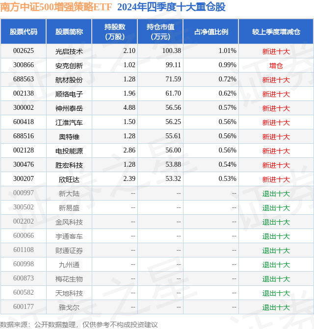 南方中证500增强策略ETF为指数型-股票基金,根据最新一期基金季报显示,该基金资产配置:股票占净值比91.85%,债券占净值比0.01%,现金占净值比7.44%。基金十大重仓股如下: