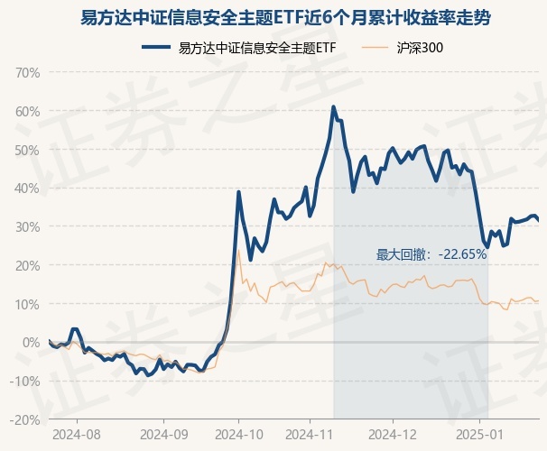 证券之星消息,1月23日,易方达中证信息安全主题ETF最新单位净值为0.8572元,累计净值为0.8572元,较前一交易日下跌0.83%。历史数据显示该基金近1个月下跌9.33%,近3个月下跌1.46%,近6个月上涨31.53%,近1年上涨22.09%。该基金近6个月的累计收益率走势如下图: