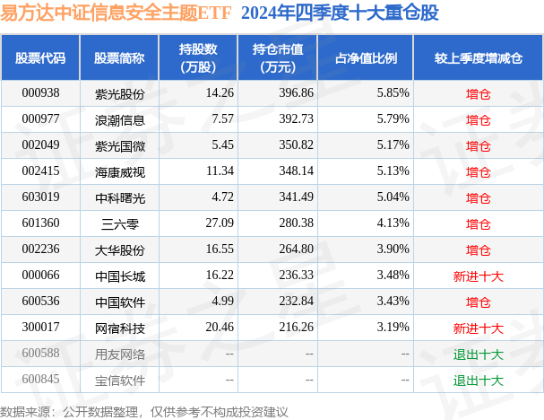 易方达中证信息安全主题ETF为指数型-股票基金,根据最新一期基金季报显示,该基金资产配置:股票占净值比98.39%,无债券类资产,现金占净值比1.68%。基金十大重仓股如下: