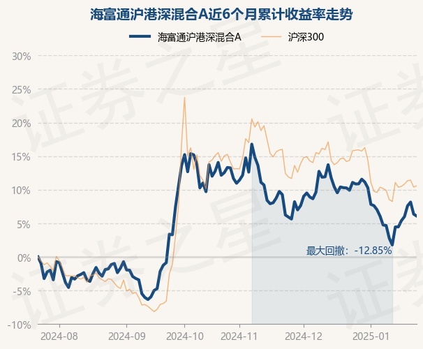 证券之星消息,1月23日,海富通沪港深混合A最新单位净值为1.32元,累计净值为1.32元,较前一交易日下跌0.28%。历史数据显示该基金近1个月下跌3.49%,近3个月下跌7.0%,近6个月上涨6.08%,近1年上涨18.55%。该基金近6个月的累计收益率走势如下图:
