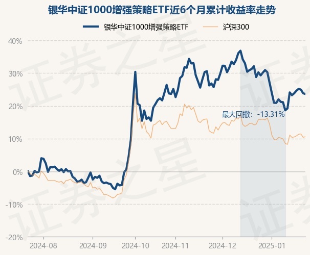 证券之星消息,1月23日,银华中证1000增强策略ETF最新单位净值为0.9883元,累计净值为0.9883元,较前一交易日下跌0.2%。历史数据显示该基金近1个月下跌4.02%,近3个月上涨1.03%,近6个月上涨23.61%,近1年上涨16.0%。该基金近6个月的累计收益率走势如下图: