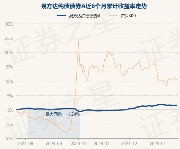 证券之星消息,1月23日,易方达纯债债券A最新单位净值为1.1127元,累计净值为1.6017元,较前一交易日下跌0.04%。历史数据显示该基金近1个月上涨0.12%,近3个月上涨1.79%,近6个月上涨1.5%,近1年上涨4.61%。该基金近6个月的累计收益率走势如下图: