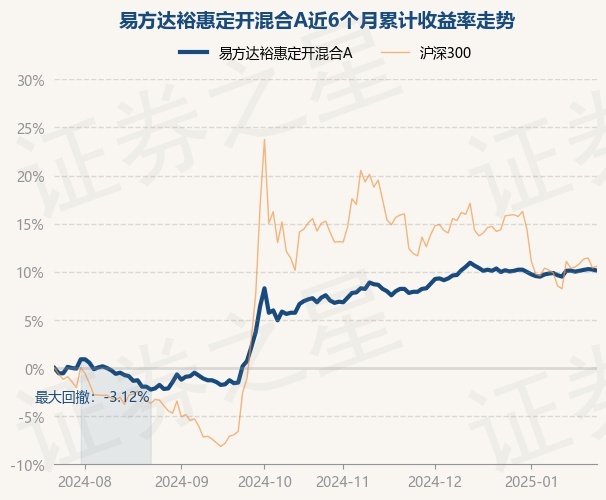证券之星消息,1月23日,易方达裕惠定开混合A最新单位净值为1.7512元,累计净值为2.5092元,较前一交易日下跌0.09%。历史数据显示该基金近1个月上涨0.14%,近3个月上涨2.68%,近6个月上涨10.13%,近1年上涨12.03%。该基金近6个月的累计收益率走势如下图:
