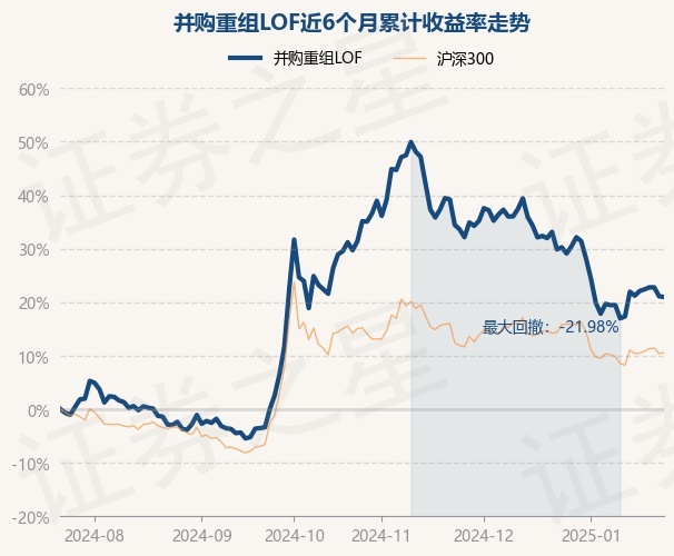 证券之星消息,1月23日,并购重组LOF最新单位净值为1.1577元,累计净值为0.4727元,较前一交易日下跌0.11%。历史数据显示该基金近1个月下跌6.85%,近3个月下跌7.8%,近6个月上涨20.97%,近1年上涨18.7%。该基金近6个月的累计收益率走势如下图: