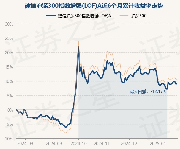 证券之星消息,1月23日,建信沪深300指数增强(LOF)A最新单位净值为1.1833元,累计净值为2.0393元,较前一交易日上涨0.42%。历史数据显示该基金近1个月下跌2.8%,近3个月下跌3.67%,近6个月上涨9.36%,近1年上涨18.31%。该基金近6个月的累计收益率走势如下图: