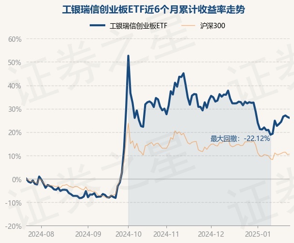 证券之星消息,1月23日,工银瑞信创业板ETF最新单位净值为1.2499元,累计净值为1.2499元,较前一交易日下跌0.33%。历史数据显示该基金近1个月下跌4.13%,近3个月下跌4.81%,近6个月上涨26.05%,近1年上涨26.37%。该基金近6个月的累计收益率走势如下图: