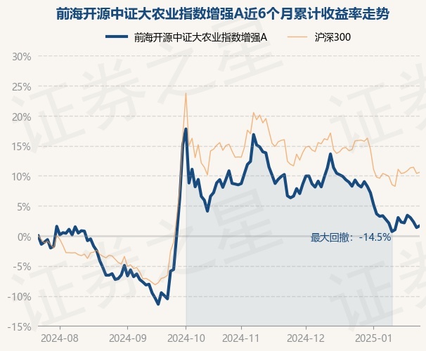 证券之星消息,1月23日,前海开源中证大农业指数增强A最新单位净值为0.8842元,累计净值为0.8842元,较前一交易日上涨0.28%。历史数据显示该基金近1个月下跌6.1%,近3个月下跌7.03%,近6个月上涨1.67%,近1年下跌1.2%。该基金近6个月的累计收益率走势如下图: