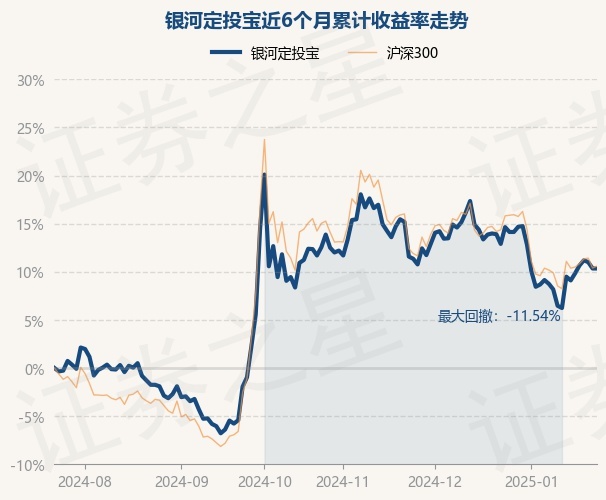 证券之星消息,1月23日,银河定投宝最新单位净值为2.849元,累计净值为2.849元,较前一交易日上涨0.0%。历史数据显示该基金近1个月下跌2.26%,近3个月下跌1.79%,近6个月上涨10.34%,近1年上涨14.97%。该基金近6个月的累计收益率走势如下图:
