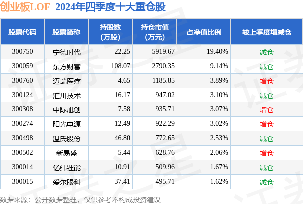 创业板LOF为指数型-股票基金,根据最新一期基金季报显示,该基金资产配置:股票占净值比94.22%,无债券类资产,现金占净值比6.2%。基金十大重仓股如下: