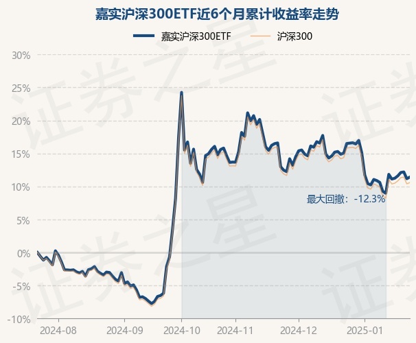 证券之星消息,1月23日,嘉实沪深300ETF最新单位净值为3.9939元,累计净值为1.809元,较前一交易日上涨0.22%。历史数据显示该基金近1个月下跌3.16%,近3个月下跌4.02%,近6个月上涨11.41%,近1年上涨20.59%。该基金近6个月的累计收益率走势如下图: