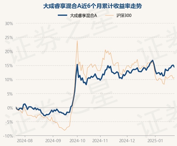 证券之星消息,1月23日,大成睿享混合A最新单位净值为1.5321元,累计净值为1.7464元,较前一交易日下跌0.58%。历史数据显示该基金近1个月上涨0.98%,近3个月上涨2.98%,近6个月上涨14.4%,近1年上涨21.9%。该基金近6个月的累计收益率走势如下图:
