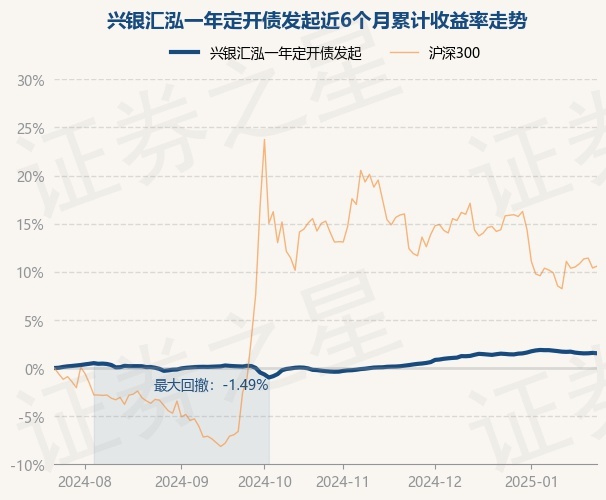 证券之星消息,1月23日,兴银汇泓一年定开债发起最新单位净值为1.0329元,累计净值为1.1054元,较前一交易日下跌0.04%。历史数据显示该基金近1个月上涨0.04%,近3个月上涨1.72%,近6个月上涨1.53%,近1年上涨3.81%。该基金近6个月的累计收益率走势如下图: