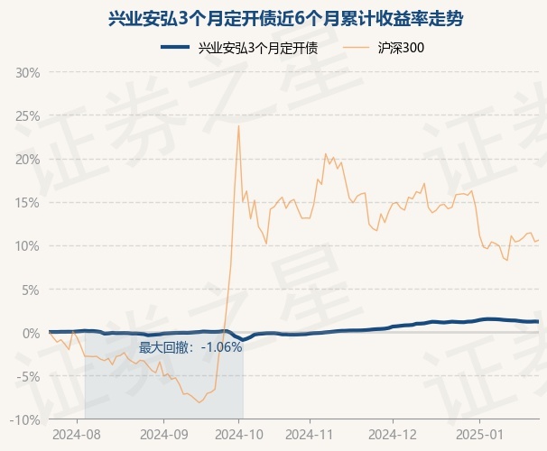 证券之星消息,1月23日,兴业安弘3个月定开债最新单位净值为1.1707元,累计净值为1.4039元,较前一交易日下跌0.03%。历史数据显示该基金近1个月上涨0.0%,近3个月上涨1.46%,近6个月上涨1.18%,近1年上涨16.99%。该基金近6个月的累计收益率走势如下图: