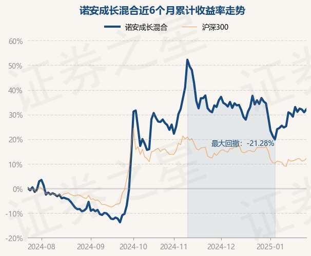 证券之星消息,1月24日,诺安成长混合最新单位净值为1.411元,累计净值为1.856元,较前一交易日上涨0.93%。历史数据显示该基金近1个月下跌2.69%,近3个月上涨4.06%,近6个月上涨32.12%,近1年上涨33.49%。该基金近6个月的累计收益率走势如下图: