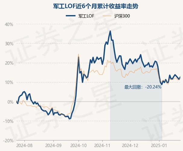 证券之星消息,1月24日,军工LOF最新单位净值为0.979元,累计净值为1.705元,较前一交易日上涨1.03%。历史数据显示该基金近1个月下跌4.95%,近3个月下跌6.14%,近6个月上涨12.53%,近1年上涨20.57%。该基金近6个月的累计收益率走势如下图: