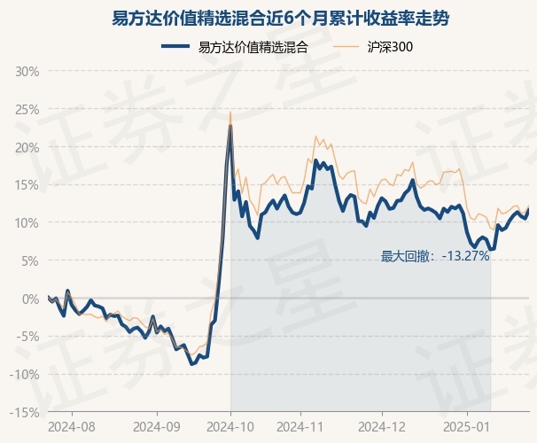 证券之星消息,1月24日,易方达价值精选混合最新单位净值为1.066元,累计净值为3.841元,较前一交易日上涨1.01%。历史数据显示该基金近1个月下跌0.14%,近3个月下跌0.13%,近6个月上涨11.59%,近1年上涨11.49%。该基金近6个月的累计收益率走势如下图: