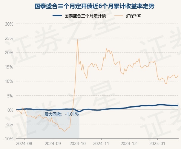 证券之星消息,1月24日,国泰盛合三个月定开债最新单位净值为1.1307元,累计净值为1.1806元,较前一交易日下跌0.01%。历史数据显示该基金近1个月下跌0.04%,近3个月上涨1.49%,近6个月上涨1.43%,近1年上涨4.07%。该基金近6个月的累计收益率走势如下图: