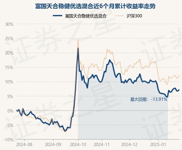 证券之星消息,1月24日,富国天合稳健优选混合最新单位净值为1.382元,累计净值为4.1775元,较前一交易日上涨0.36%。历史数据显示该基金近1个月下跌3.05%,近3个月下跌3.68%,近6个月上涨7.18%,近1年上涨2.35%。该基金近6个月的累计收益率走势如下图: