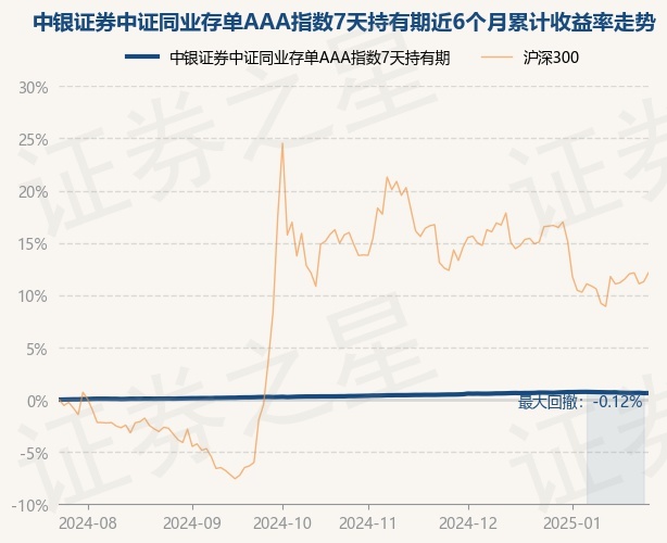 证券之星消息,1月24日,中银证券中证同业存单AAA指数7天持有期最新单位净值为1.0243元,累计净值为1.0243元,较前一交易日上涨0.0%。历史数据显示该基金近1个月下跌0.05%,近3个月上涨0.3%,近6个月上涨0.63%,近1年上涨1.63%。该基金近6个月的累计收益率走势如下图: