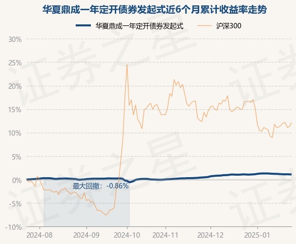证券之星消息,1月24日,华夏鼎成一年定开债券发起式最新单位净值为1.1345元,累计净值为1.1345元,较前一交易日下跌0.01%。历史数据显示该基金近1个月上涨0.0%,近3个月上涨1.09%,近6个月上涨1.11%,近1年上涨4.84%。该基金近6个月的累计收益率走势如下图: