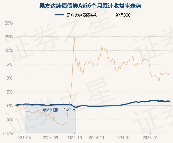 证券之星消息,1月24日,易方达纯债债券A最新单位净值为1.1123元,累计净值为1.6013元,较前一交易日下跌0.04%。历史数据显示该基金近1个月上涨0.13%,近3个月上涨1.79%,近6个月上涨1.44%,近1年上涨4.55%。该基金近6个月的累计收益率走势如下图: