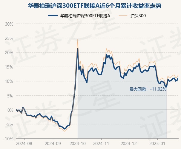 证券之星消息,1月24日,华泰柏瑞沪深300ETF联接A最新单位净值为0.9451元,累计净值为1.8581元,较前一交易日上涨0.78%。历史数据显示该基金近1个月下跌3.37%,近3个月下跌1.98%,近6个月上涨11.08%,近1年上涨17.73%。该基金近6个月的累计收益率走势如下图: