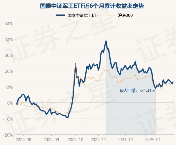 证券之星消息,1月24日,国泰中证军工ETF最新单位净值为0.9907元,累计净值为0.9907元,较前一交易日上涨1.03%。历史数据显示该基金近1个月下跌5.21%,近3个月下跌6.51%,近6个月上涨13.24%,近1年上涨22.11%。该基金近6个月的累计收益率走势如下图: