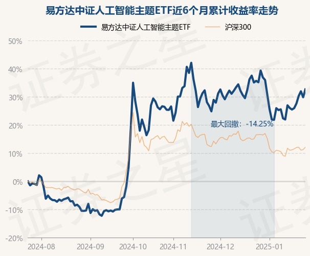 证券之星消息,1月24日,易方达中证人工智能主题ETF最新单位净值为0.922元,累计净值为0.922元,较前一交易日上涨2.16%。历史数据显示该基金近1个月下跌2.23%,近3个月上涨5.64%,近6个月上涨32.68%,近1年上涨41.3%。该基金近6个月的累计收益率走势如下图: