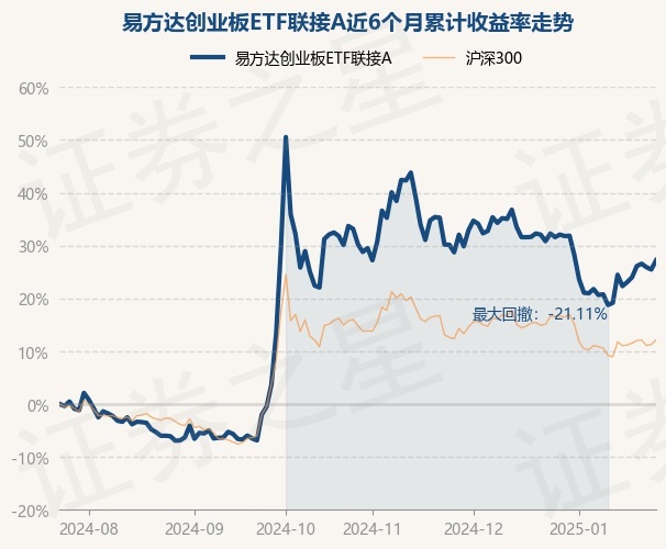 证券之星消息,1月24日,易方达创业板ETF联接A最新单位净值为2.1792元,累计净值为2.1792元,较前一交易日上涨1.39%。历史数据显示该基金近1个月下跌3.83%,近3个月下跌2.23%,近6个月上涨27.21%,近1年上涨24.06%。该基金近6个月的累计收益率走势如下图: