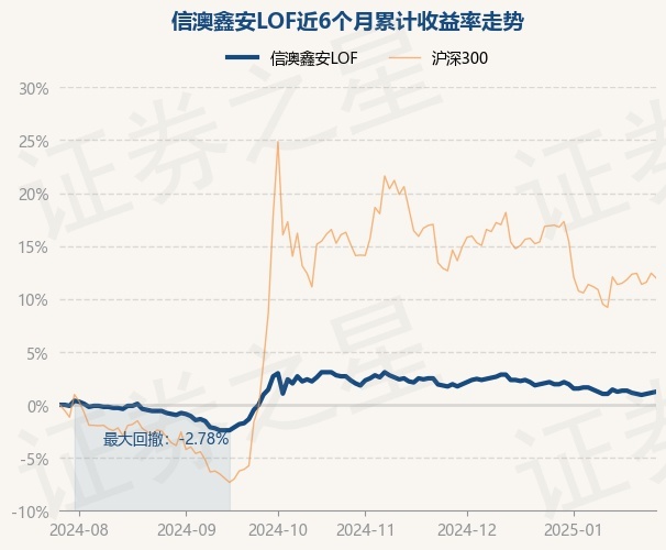 证券之星消息,1月27日,信澳鑫安LOF最新单位净值为1.001元,累计净值为1.379元,较前一交易日上涨0.1%。历史数据显示该基金近1个月下跌0.69%,近3个月下跌1.43%,近6个月上涨1.23%,近1年上涨2.01%。该基金近6个月的累计收益率走势如下图: