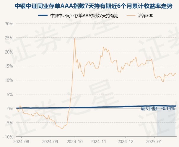 证券之星消息,1月27日,中银中证同业存单AAA指数7天持有期最新单位净值为1.0552元,累计净值为1.0552元,较前一交易日上涨0.07%。历史数据显示该基金近1个月上涨0.02%,近3个月上涨0.5%,近6个月上涨0.82%,近1年上涨2.09%。该基金近6个月的累计收益率走势如下图: