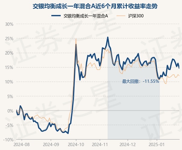证券之星消息,1月27日,交银均衡成长一年混合A最新单位净值为0.8019元,累计净值为0.8649元,较前一交易日下跌1.39%。历史数据显示该基金近1个月下跌3.05%,近3个月下跌3.78%,近6个月上涨14.69%,近1年上涨14.02%。该基金近6个月的累计收益率走势如下图: