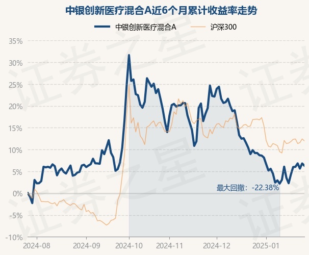 证券之星消息,1月27日,中银创新医疗混合A最新单位净值为1.1826元,累计净值为1.2381元,较前一交易日下跌0.47%。历史数据显示该基金近1个月下跌2.2%,近3个月下跌14.16%,近6个月上涨6.3%,近1年上涨6.0%。该基金近6个月的累计收益率走势如下图: