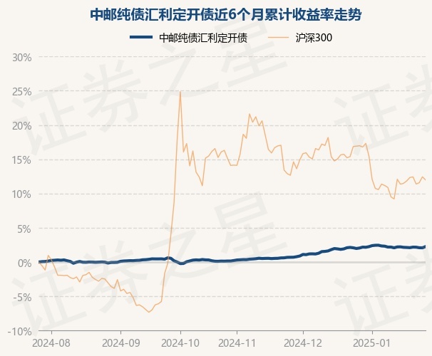 证券之星消息,1月27日,中邮纯债汇利定开债最新单位净值为1.0337元,累计净值为1.2394元,较前一交易日上涨0.17%。历史数据显示该基金近1个月上涨0.08%,近3个月上涨2.11%,近6个月上涨2.26%,近1年上涨5.18%。该基金近6个月的累计收益率走势如下图: