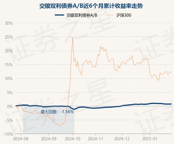 证券之星消息,1月27日,交银双利债券A/B最新单位净值为1.3948元,累计净值为1.7328元,较前一交易日上涨0.05%。历史数据显示该基金近1个月上涨0.06%,近3个月上涨1.4%,近6个月上涨0.74%,近1年上涨3.59%。该基金近6个月的累计收益率走势如下图: