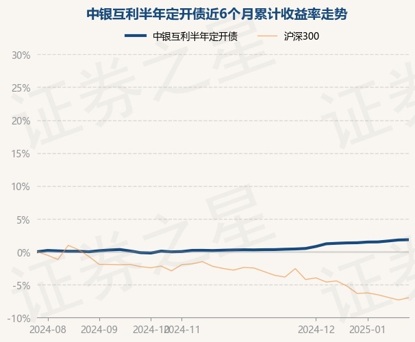 证券之星消息,1月27日,中银互利半年定开债最新单位净值为1.2309元,累计净值为1.2829元,较前一交易日上涨0.04%。历史数据显示该基金近1个月上涨0.48%,近3个月上涨1.85%,近6个月上涨1.83%,近1年上涨4.52%。该基金近6个月的累计收益率走势如下图:
