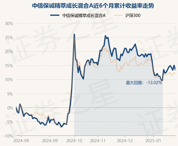 证券之星消息,1月27日,中信保诚精萃成长混合A最新单位净值为0.7311元,累计净值为3.6917元,较前一交易日下跌1.35%。历史数据显示该基金近1个月下跌4.49%,近3个月下跌3.24%,近6个月上涨13.44%,近1年上涨12.98%。该基金近6个月的累计收益率走势如下图: