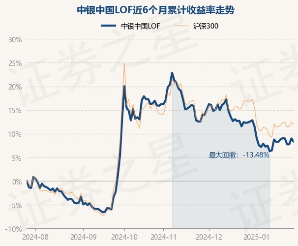 证券之星消息,1月27日,中银中国LOF最新单位净值为0.7955元,累计净值为4.293元,较前一交易日下跌0.61%。历史数据显示该基金近1个月下跌3.79%,近3个月下跌6.93%,近6个月上涨8.33%,近1年上涨3.1%。该基金近6个月的累计收益率走势如下图: