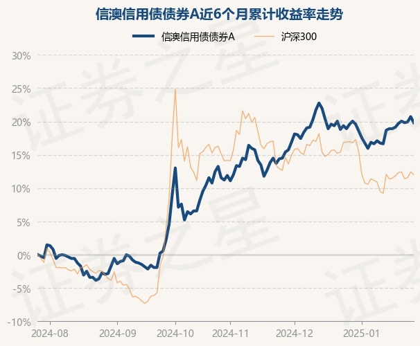 证券之星消息,1月27日,信澳信用债债券A最新单位净值为1.058元,累计净值为1.58元,较前一交易日下跌0.75%。历史数据显示该基金近1个月下跌0.19%,近3个月上涨6.55%,近6个月上涨19.82%,近1年上涨11.49%。该基金近6个月的累计收益率走势如下图: