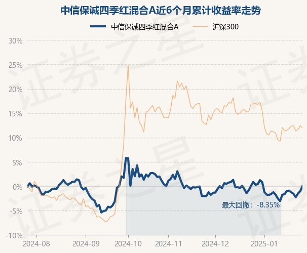 证券之星消息,1月27日,中信保诚四季红混合A最新单位净值为0.8702元,累计净值为2.7706元,较前一交易日上涨1.09%。历史数据显示该基金近1个月下跌0.39%,近3个月下跌1.82%,近6个月上涨0.05%,近1年上涨10.8%。该基金近6个月的累计收益率走势如下图: