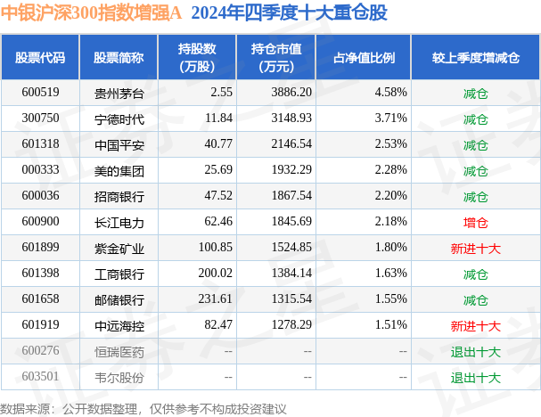 中银沪深300指数增强A为指数型-股票基金,根据最新一期基金季报显示,该基金资产配置:股票占净值比93.09%,无债券类资产,现金占净值比18.3%。基金十大重仓股如下: